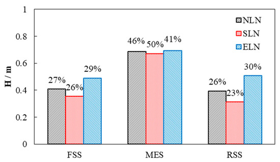 The head loss of the draft tube is shown in Figure 8. The head loss in MES accounts for most of the head loss of the entire draft tube, more than 40%, and the head losses in FSS and RSS are small and almost equal. However, due to the short length of FSS, it is considered that the hydraulic loss of the draft tube is mainly concentrated in FSS and MES. The head loss of the draft tube is highest for ELN, followed by NLN, and lowest for SLN in different downstream structures. For NLN, the head loss of the FSS accounts for 27% of the total head loss of the draft tube, MES accounts for 46%, and RSS accounts for 26%. For SLN, the head loss of FSS and RSS is significantly smaller than that of NLN, and the head loss of MES is slightly smaller than that of NLN; however, the proportion of head loss increases to 50%. The locking nut improves the flow pattern of the draft tube and reduces the hydraulic loss, especially in FSS and RSS. For ELN, FSS, and RSS, the head loss is significantly greater than that of NLN and SLN. The head loss of MES is similar to that of NLN and slightly greater than that of SLN; however, the proportion of head loss decreases to 41%. Extended locking nuts may cause deterioration in the flow pattern, especially in FSS and RSS.