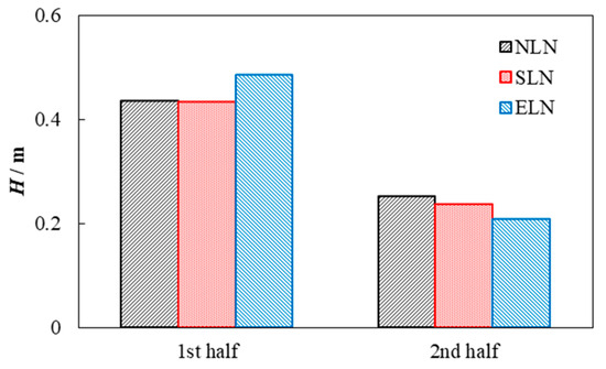 Further analysis of MES, which accounts for the majority of hydraulic losses in the draft tube, shows that the head loss in the first half is significantly greater than that in the second half, as shown in Figure 9. For NLN, the head loss in the first half of MES is less than twice that in the second half. For SLN, the head loss in the first and second half of MES is slightly smaller than that of NLN. The locking nut improves the MES flow state. For ELN, the head loss in the first half of MES is greater than that in NLN and SLN, but the head loss in the second half of MES is smaller than that in NLN and SLN, and the head loss in the first half of MES is twice that of the second half. The extended nut does not improve the flow state in the first half of MES but improves the flow state in the second half.