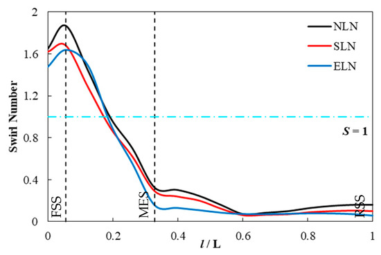 For NLN, the apparent change in the rotational radius of the swirling mainstream begins near the RSS inlet, and the vortex return extends into the first half of the RSS with a smaller rotational radius. For SLN, the apparent change in the rotational radius of the swirling mainstream begins near the RSS inlet, and the flow velocity of the outer swirling mainstream at the inlet is slightly less than that of NLN, while the pitch entering RSS is greater than that of NLN. The swirling backflow basically disappears until MES. For ELN, the obvious change in the rotational radius of the internal swirling mainstream begins in the second half of RSS, and the obvious change in the rotational radius of the outer swirling mainstream begins near the RSS inlet. The swirling mainstream has a higher flow velocity before RSS, and the internal swirling mainstream enters RSS with a larger pitch. The swirling backflow extends to the second half of RSS, and the rotation radius is slightly larger.