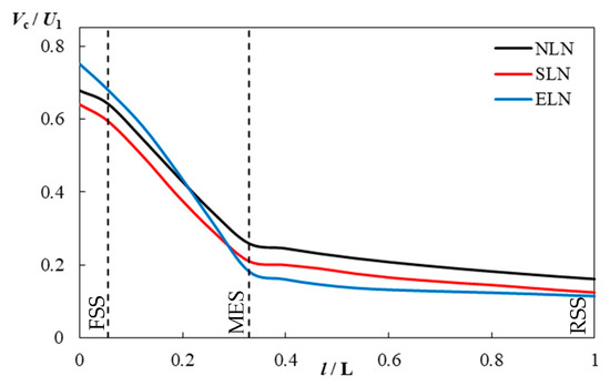 The swirling flow contains axial and circumferential velocity components, and the circumferential velocity component is the main reason for the hydraulic loss of the draft tube, as shown in Figure 11. The circumferential velocity of FSS and MES decreases rapidly, while the circumferential velocity of RSS decreases slowly. The circumferential velocity of the draft tube inlet is the largest in ELN, followed by NLN, and the smallest in SLN. In FSS and MES, the circumferential velocity of ELN decreases the fastest, and the circumferential velocities of SLN and NLN decrease at essentially the same rate; however, both are smaller than that of ELN. In RSS, the circumferential velocity of ELN remains almost constant, and both the SLN and NLN decrease in circumferential velocity at a lower rate and are essentially the same. The circumferential velocity of SLN decreases to the same as that of ELN at the RSS outlet cross-section.