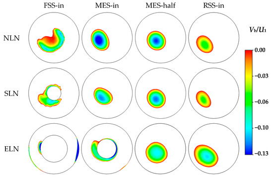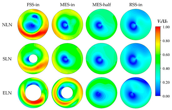 The circumferential velocity of the draft tube increases gradually from the center to the wall, as shown in Figure 12. For NLN, there are two elliptical low circumferential velocity zones in the middle of the FSS inlet, and it develops into an eccentric elliptical low circumferential velocity zone when the MES inlet and this low-velocity zone gradually expands and maintains until the RSS inlet. For SLN, there is an eccentric elliptical low circumferential velocity zone located close to the locking nut in the FSS inlet, and this low-velocity zone gradually expands and maintains up to the RSS inlet. For ELN, there is a long strip low circumferential velocity zone near the locking nut in the inlet of FSS, and the position of this low-velocity zone rotates about 90 degrees clockwise compared with SLN. At the MES inlet, this low-velocity zone rotates counterclockwise by about 90 degrees. By the halfway point of the MES, the low-velocity zone rotates counterclockwise by about 45 degrees and develops into an eccentric ellipse, gradually expanding and maintaining the RSS inlet.
