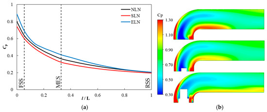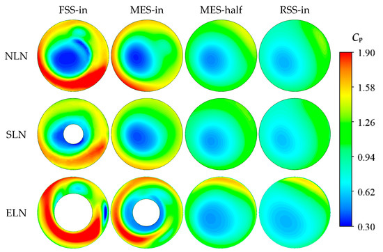 For NLN, the low-pressure zone of the FSS inlet is elliptical near the axis, the high-pressure region is close to the wall, and the high-pressure region on one side of the wall is significantly higher than that on the other side. At the MES inlet, both the high-pressure and low-pressure zones decrease and rotate clockwise by about 45°. At the halfway point of the MES, the range of the low-pressure zone further decreases and rotates clockwise by about 45°, while the high-pressure zone disappears. At the RSS inlet, the range of the low-pressure zone continues to shrink and continues to rotate clockwise by a certain angle. For SLN, the low-pressure zone of the FSS inlet surrounds the locking nut, the pressure in the low-pressure zone slightly increases compared to that of NLN, and the high-pressure area is close to one side of the wall. The zone of high and low-pressure zones is reduced by more than half compared to that of NLN. Toward the MES inlet, the low-pressure zone fills the nut position and the range expands, while the high-pressure area basically disappears. In the halfway points of the MES and the RSS inlets, the range of the low-pressure zones is further reduced, and it continues to rotate clockwise at a certain angle. For ELN, the low-pressure zone in the inlet of the FSS is dispersed into two locations, one near the nut and the other near the wall, both of which are elliptical, and the zone is more than half that of SLN. One side of the high-pressure zone is close to the wall and the other side is close to the locking nut, with an area about twice that of SLN, almost consistent with NLN. At the MES inlet, the low-pressure zone is concentrated near the locking nut, and the range is expanded. The low-pressure zone near the wall disappears, and the range of the high-pressure zone slightly decreases, rotating clockwise by about 45°. At the halfway point of the MES and RSS inlets, the low-pressure range slightly increases, while the high-pressure range continues to shrink and continues to rotate clockwise at a certain angle. It can be seen from the above that the existence of the locking nut will slightly increase the pressure in the surrounding area; however, it still belongs to the low-pressure range. The extended nut will greatly increase the pressure in the surrounding area, making it exceed the low-pressure range and belong to the high-pressure range. The locking nut has a suppressive effect on the generation of low pressure, and the extended nut has a more significant inhibitory effect.