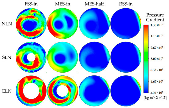 For NLN, the high-pressure gradient region of the FSS inlet is located near the wall, which is a circular region, while the low-pressure gradient region is located near the wall and axis. At the MES inlet, the high-pressure gradient zone is closely attached to the wall, with a reduced range. The low-pressure gradient zone is only near the axis, with a slightly larger range, but dispersed into two zones. Halfway through the MES, the high-pressure gradient zone disappears, and the low-pressure gradient zone occupies half of the cross-section range. At the RSS inlet, the low-pressure gradient zone almost completely occupies the cross-section. For SLN, the high-pressure gradient zone at the FSS inlet is located near the wall, forming a circular shape, which reduces the range compared to that of NLN. The low-pressure gradient zone is located around the wall and the locking nut. The circular low-pressure gradient zone around the wall is slightly thickened compared to that of NLN, and the range of the low-pressure gradient zone around the locking nut is slightly reduced compared to that near the axis of NLN. At the MES inlet, the high-pressure gradient zone disappears, and the axial low-pressure gradient zone slightly increases compared to that of NLN. Halfway through the MES, the high-pressure gradient zone disappears, and the low-pressure gradient zone occupies more than half of the cross-section range. At the RSS inlet, the low-pressure gradient zone almost completely occupies the cross-section. For ELN, the high-pressure gradient region of the FSS inlet occupies most of the area of the section, which is significantly larger than that of NLN. The low-pressure gradient region is located in the circular region of the wall less than half of the circumference, which is significantly smaller than that of NLN. At the MES inlet, the high-pressure gradient zone slightly decreases, located in the circular ring near the wall and nut, which is a significantly larger range compared to that of NLN. To the half of MES, the high-pressure gradient region disappears, and the low-pressure gradient region occupies more than half of the cross-section. At the RSS inlet, the low-pressure gradient region almost completely occupies the cross-section. As can be seen from the above, the existence of a locking nut significantly affects the pressure gradient distribution. The small size locking nut significantly reduces the pressure gradient, and the extended locking nut significantly increases the pressure gradient before MES; however, the decrease after entering the MES increases rapidly.