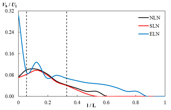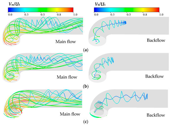 Main flow and backflow in the draft tube (Vm is the main flow velocity, Vb is the backflow velocity): (a) NLN; (b) SLN; (c) ELN.