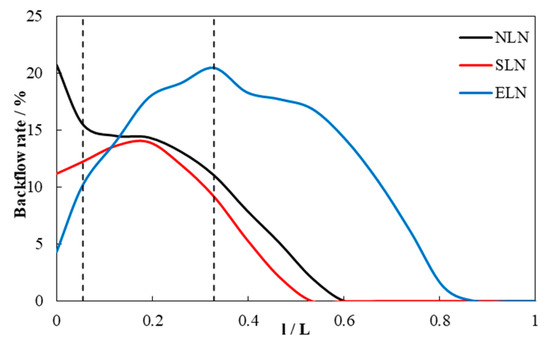 The backflow velocity of NLN and SLN at the draft tube inlet is small, and the backflow rate is high, while the backflow velocity of ELN at the draft tube inlet is large, and the backflow rate is low, as shown in Figure 17 and Figure 18. For NLN, the backflow velocity increases slightly in FSS and then continues to decrease. The backflow rate has maintained a downward trend, from the rapid decline in FSS to the slow decline in MES, and then to the rapid decline in RSS. The backflow zone gradually develops from the irregular shape near the axis in FSS to the elliptical shape near the wall of RSS, and finally disappears in the first half of RSS, as shown in Figure 19. For SLN, the increase rate of backflow velocity in FSS is less than that of NLN, and it begins to decrease in the first half of MES with a decrease rate greater than that of NLN. The backflow rate increases slowly in the first half of MES and then begins to decrease, with a faster rate of decrease than NLN. The backflow zone is smaller than that of the NLN. It gradually develops from an irregular shape around the locking nut in FSS to an elliptical shape near the wall of RSS. Finally, the backflow disappears in the first half of RSS, and the disappearance position was earlier than that of NLN. For ELN, the backflow rate develops into a slow decline after the rapid decline in FSS. The backflow rate keeps rising rapidly before RSS. After reaching RSS, it first experiences a slow decline and then a sharp decline. The backflow zone gradually increases from a small zone around the locking nut in FSS, with a zone much smaller than that of SLN and NLN, to an elliptical shape near the wall of RSS, with a zone larger than that of SLN and NLN, and then gradually decreases. Finally, the backflow disappears in the second half of RSS.
