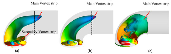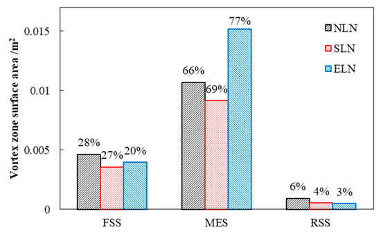 The surface area of the draft tube vortex strip in each cross-section along the flow direction shows a trend of first increasing and then decreasing, as shown in Figure 21. For NLN, the vortex surface area of FSS accounts for 28% of the total surface area of the draft tube vortex, that of MES accounts for 66%, and that of RSS accounts for 6%. For SLN, the vortex strip surface area of each section is significantly smaller than that of NLN, but the vortex strip surface area proportion of MES increases to 69%. It can be seen that the locking nut can significantly reduce the size of the vortex strip, but the degree of the reduction of the MES is smaller than that of other sections. For ELN, both FSS and RSS vortex strip surface areas are significantly reduced compared to that of NLN, and the vortex strip surface area in the MES is significantly increased compared to that of NLN; however, the vortex strip surface area decreases sharply in RSS, which shows that the extended locking nut contributes little to the reduction in vortex strip before RSS but can reduce the vortex strip sharply in RSS.