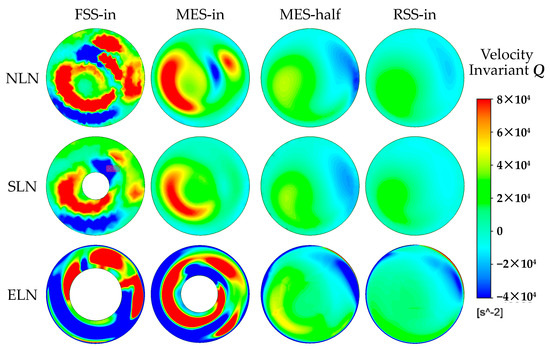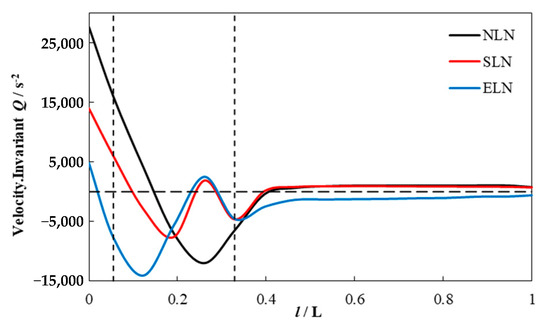 where S is the absolute value of the strain rate and Ω is the absolute value of vortices. When the velocity invariant Q > 0, it indicates that the rotation rate of the fluid in this region is greater than the strain rate, and the flow vortex structure is dominant.