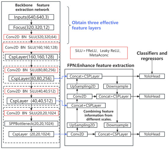 To enhance the expressive power of the model while considering the speed of computation, selecting an appropriate activation function is crucial. Currently, the activation functions widely used in the YOLOv5 model include SiLU [20], FReLU [21], Leaky ReLU [22], and MetaAConc, among others. The SiLU function’s primary advantage is its ability to produce non-zero activation values for negative inputs, thereby addressing the issue of traditional ReLU functions yielding zero activation for negative inputs. It also facilitates better gradient propagation while retaining certain non-linear characteristics. The FReLU function addresses the spatial insensitivity issue within activation functions, enabling regular convolutions to capture complex visual layouts and endowing the model with pixel-level modeling capabilities. Leaky ReLU, a variant of the rectified linear unit (ReLU) activation function, ensures neuron activation, enhancing the neural network model’s non-linear fitting ability. The MetaAConc function, starting from the ReLU function, uses the Smooth Maximum approximation to prove that Swish is an approximate smooth representation of the ReLU function [23].