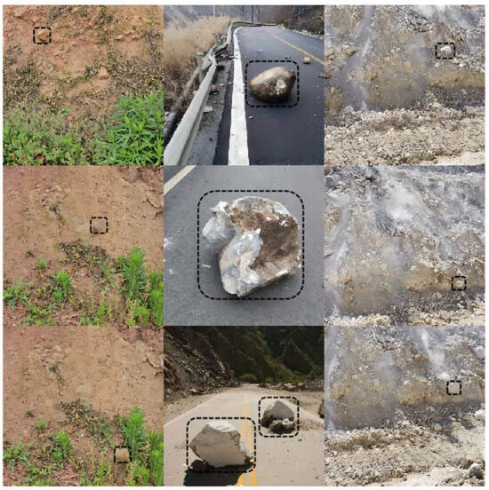 Currently, the mainstream public datasets in the field of object detection include the COCO dataset and the PASCAL VOC dataset [19]. However, it is challenging to find a sufficient quantity of data related to foreign object intrusion in railway slope scenarios within these public datasets, underscoring the importance of constructing a proprietary dataset for the detection of rockfall intrusions on railway slopes. This paper, through the processing and analysis of aerial survey data from an existing railway project in Shandong, China, examines the installation positions, heights, and angles of monitoring cameras within the railway context, thereby collecting a dataset for foreign object intrusion detection against the backdrop of railway slopes. The dataset primarily encompasses hazardous rocks and falling stones against the backdrop of existing railway slopes, including rocks of various shapes, sizes, and orientations. To accurately reflect engineering scenarios, the dataset also accounts for weather conditions, varying lighting conditions at different times, and the impact of camera focal lengths. Pre-collection of data for the automated detection model of existing line slope rockfall disasters primarily involves the gathering and processing of image data about experimental slope rockfalls. Based on a high-precision three-dimensional visualization model of the target area, image collection equipment is deployed along the experimental target section, and preliminary coordinated testing is conducted to pre-sample the slope structure data, strategically selecting surveillance locations with a focus on monitoring high-risk rockfall areas. This involves repeatedly collecting and filtering data that meet the criteria of image collection resolution, scene representativeness, and substantial image data volume. The data are then processed, including frame-by-frame extraction from videos and data augmentation, to amass a dataset that meets the requirements for later algorithm testing and training, providing a reliable material basis for the automated recognition and interpretation of high slope rockfall disasters. In this study, slope rockfalls of various sizes and orientations were primarily selected. During the collection process, different camera heights, angles, and positions were chosen to ensure the diversity and coverage of the dataset, with some of the data illustrated in Figure 2.