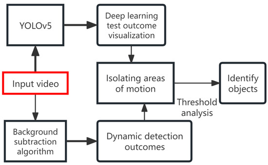 To achieve high recognition efficiency and precision, this study analyzes the characteristics of high-risk targets on railway slopes and finds that target foreign objects often exhibit movement traits. In real scenarios, as opposed to low-risk stationary objects, hazardous rocks display significant kinetic energy, moving down slopes toward the railway. Even in non-operational periods with clean backgrounds, the intrusion of foreign objects into slope areas is due to their kinetic energy. Therefore, this research incorporates BackgroundSubtractorMOG2 as an auxiliary detection algorithm, combining YOLOv5’s identification capabilities with background subtraction to obtain dynamic monitoring results for comprehensively determining the location of falling rocks, as illustrated in Figure 3.