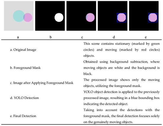 Figure 4 demonstrates the basic detection workflow with simple images, from filtering moving targets to YOLO-based detection, represented from a to b.