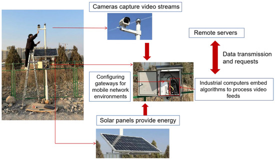 Initially, experimenters identified areas at risk of rockfall activity on the target railway based on preliminary point cloud data and aerial survey results. Cameras were used to collect data on moving rockfalls in the target area, ensuring diversity of background and breadth of targets. After preliminary data collection, an on-site survey was conducted in the target area to determine the best locations for camera installation, ensuring the detection range would adequately cover the target area. After this, equipment installation involved excavating sites for the cameras, laying reinforced concrete foundations, and mounting the cameras after the concrete had been set. Due to the unavailability of a local power supply, solar panels were used to power the devices. After connecting the power supply, the industrial computer and gateway were configured, activating the camera equipment. The cameras then monitored the target area to assess coverage detection accuracy and orientation. The industrial computer was connected to a remote server, preparing the system for algorithm integration and application.