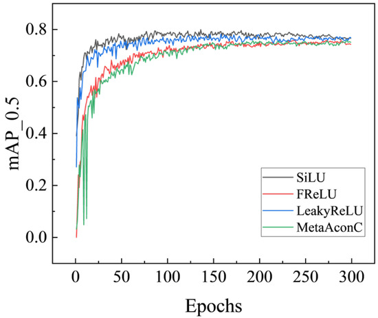 The results revealed that adjustments to the activation function caused noticeable differences in the model’s accuracy and detection speed, with these differences primarily manifesting in terms of detection speed. Moreover, when observing the entire detection process, the variance in accuracy altered as the training progressed. Throughout the training phase, as visualized in Figure 6, even though the distinctions between models narrowed after 250 rounds, the performance of SiLU and LeakyReLU was significantly superior to that of FReLU and MetaAconC functions in terms of accuracy. Simultaneously, as shown in Table 2, regarding detection speed, the model utilizing the SiLU function achieved a detection speed of 81.45 fps, and the model employing the LeakyReLU function reached a speed of 79.10 fps, both significantly outpacing the model with the FReLU function at 44.63 fps and the model with the MetaAconC function at 27.49 fps.