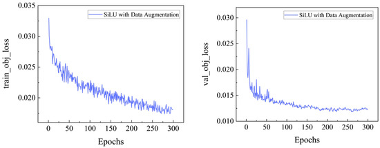 The outcomes indicate that by escalating the level of data augmentation, the problem of overfitting was efficaciously mitigated. With robust data augmentation, the overfitting issue was essentially resolved over 300 training cycles, and a noticeable enhancement in the average accuracy of the training was also observed, as depicted in Figure 9. Furthermore, as Table 4 elucidates, in comparison to the pre-improvement SiLU function models, there was a significant augmentation in both detection precision and speed.