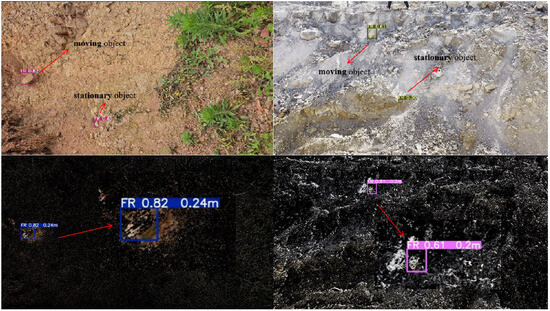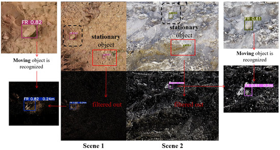 In practical engineering scenarios, the mobility of an object is crucial in assessing its level of danger. In existing railway slopes, instances of singular rolling rockfall invasions are rare; most scenes are complex, featuring stationary objects that can interfere with risk detection. These are non-moving objects in the neural network that share origins with the detection targets, which a single neural network cannot avoid recognizing. Therefore, filtering out these less risky stationary objects is critical. As illustrated in Figure 10, interference targets exist in both scenes 1 and 2. A solitary neural network indiscriminately identifies targets, leading to potential misguidance, whereas models employing background subtraction algorithms can effectively filter out stationary objects, yielding more accurate detection results. The aforementioned images represent the detection outcomes of our model for specific slope scenarios.