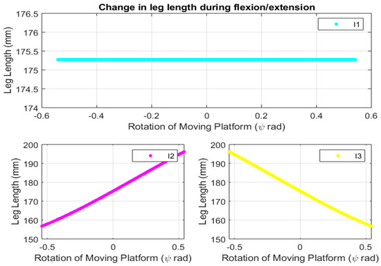 The leg lengths or the actuation needed to rotate the moving platform was found out using Equation (5):
