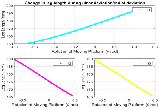 During flexion and extension motions, the top platform of the robot is rotated only by the Ψ angle about the X-axis. Then, during ulnar and radial deviation motions, the top platform of the robot is rotated only by the θ angle about the Y-axis. Since this robot is used only to perform said motions, there is no need of rotation about the Z-axis; hence, the angle ϕ about the Z-axis is always zero. The fixed length of the central leg of the robot is denoted by “l” (l = 171.43 mm). The radius of base and top platforms is r1 = 82 mm and r2 = 45.5 mm, respectively.