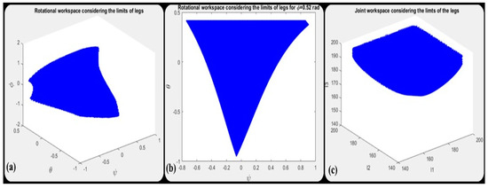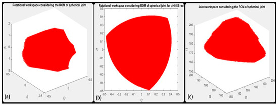 The capability of a robot can be evaluated in terms of its workspace. The robot workspace depends on the dimensions of the robot and various other factors. It is usually defined in a cartesian coordinate system. The workspace of the joint motions is called the joint workspace. It is possible to calculate the joint workspace from the inverse kinematic model [37]. The rotational workspace and joint workspace of the proposed robot are presented in Section 4.3.