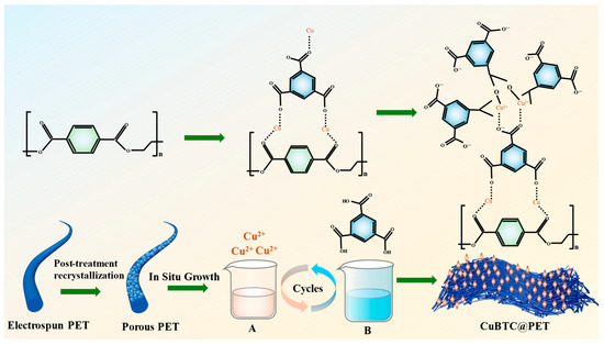 CuBTC@PET fiber was based on the method of synthesizing CuBTC powder in an aqueous phase under room-temperature conditions. PET electrospun fibers were used as the substrate so that Cu2+ ions and homobenzoic acid were used to directly grow CuBTC crystals in situ on PET fibers. DMF, deionized water, and ethanol were mixed in a 1:1:1 ratio to 48 mL, and 3.6 g of Cu(NO3)2-3H2O and 1.35 g of BTC were added. Then, the two solutions were dispersed by ultrasonication for 20 min; the specific parameters were as follows: the ultrasonic power was 230 W, the closed cycle time was 15 s, and the open cycle time was 45 s. The Cu2+-containing solution A and the BTC ligand solution B were obtained. The PET fiber membrane before and after recrystallization treatment was cut to 20 cm × 20 cm, and the metal skeleton was grown layer-by-layer as follows: the fiber membrane was immersed into solution A for 15 min, washed with anhydrous ethanol for 15 s, immersed into solution B for 15 min, and then washed with anhydrous ethanol for 15 s. The above steps are one cycle. The sample was cycled for 3, 5, 7, or 9 cycles. Finally, the composite fiber membrane with ethanol was cleaned 4 times to remove the residual Cu2+ and ligand from the fiber surface. The prepared fiber membranes were dried in a fume hood for 12 h to obtain CuBTC@PET composite fiber membranes with different growth cycles. The detailed route of the experiment is shown in Figure 1.