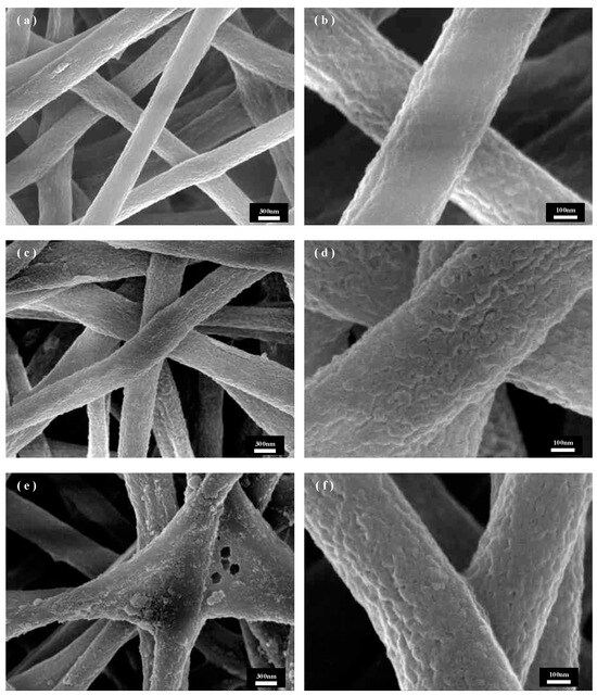 The soaking treatment time is also an important parameter that affects the surface morphology of solution-recrystallized PET fibers. Under the solvent ratio of NMP/EtOH of 1:1, Figure 4 shows the SEM images of PET fibers under different time conditions of immersion treatment, from which it can be learned that the roughness of the fibers does not change much with the increase in immersion time. Figure 4b,d,f shows the local fiber enlargement SEM image, where the different soaking times under the fiber surface morphology changes are not large and the void and pore structures are similar; this is due to the void and pore structures being mainly affected by the process of phase separation, which is mainly affected by the proportion of solvent. The formation of voids and pores occurs in the drying stage of the fiber after the immersion; therefore, the soaking time has little effect on the fiber surface void and pore structure. Observation of Figure 4a,c,e reveals that in 30 min and 45 min of immersion time, each fiber remains independent of the other, and the overall morphology of the fiber membrane is better. When the immersion time increased to 60 min, as shown in Figure 4e, the fiber appeared to be sticky and collapsed, which may be because with the increase of the immersion time, the degree of swelling of the fibers deepens, and the mixture of solutions penetrates deeper into the fiber, and during the immersion process, the fiber surface is not affected by the formation of voids and pores; therefore, there is no significant effect on the void and pore structure of the fiber surface. This may be because with the increase of soaking time, the degree of fiber swelling deepens, the mixed solution penetrates the fiber, and the fiber collapses during the soaking process, and due to the deepening of the degree of swelling, the residual NMP solution inside the fiber in the subsequent EtOH cleaning process results in a sticky phenomenon in the drying process. In summary, 45 min was chosen as the parameter for the preparation of swelling recrystallization. The subsequent steps of the experiment were carried out.