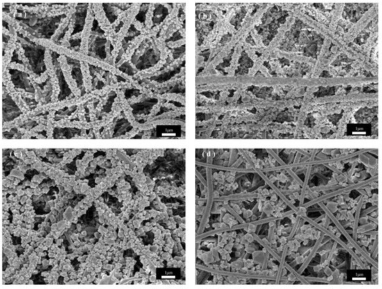 Figure 5 shows SEM images of PET@CuBTC composite fiber membranes under different growth cycles of PET fiber membranes, where CuBTC is produced by bonding Cu2+ with three -COOH groups above the ligand BTC to produce a regularly arranged metal–organic skeleton. During the layer-by-layer growth of CuBTC on the surface of PET fibers, the Cu2+ is bonded with the -COOH groups at the ends of the PET molecular chains first, followed by a further increase in the size of the skeleton in subsequent cycles. COOH is followed by a layer-by-layer bonding arrangement of Cu2+ with the ligand in subsequent cycling cycles, and the skeleton size is further increased. Figure 5a shows that the CuBTC crystals grow more uniformly in size on the fiber surface at three cycles, but there are still many vacancies on the fiber surface where the crystal layer does not grow. The size of the skeleton gradually increases as the growth cycle increases. Figure 5b shows that in five cycles, when the crystal growth is uniform, the PET fiber surface is covered by the crystal layer, the skeleton size is moderate, and the PET fiber size is more compatible, and the overall fiber morphology is maintained. In Figure 5b, when increased to seven cycles, the skeleton size increases, the skeletons stack on top of each other to grow, the fiber gap is gradually filled by the skeleton, and the crystal size does not match the size of the fiber, resulting in the composite fiber stacking being too dense. Figure 5b shows that when the growth cycle is further increased to nine cycles, the skeleton size is too large and extremely mismatched with the fiber size. The PET fiber substrate was exposed to only a small amount of crystal growth embedded between the fibers, which may be due to the gradual growth of the skeleton on different fibers into one, where the chemical bond between PET and CuBTC could not withstand the shear force generated by its gravity and the relative motion between the fibers, which resulted in the shedding of the skeleton and the exposure of part of the fiber surface. In summary, for the in situ growth of CuBTC on PET fibers in this study, the CuBTC@PET composite fibers under the five-cycle condition have excellent surface morphology.