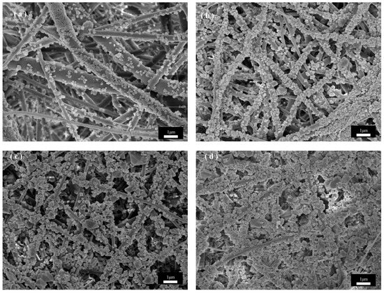 SEM images of CuBTC@PET composite fibers under different growth cycles: (a) three cycles, (b) five cycles, (c) seven cycles, (d) nine cycles.