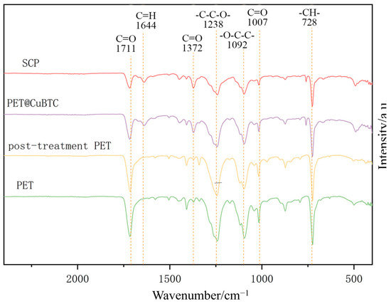 The FTIR profiles of the fiber membranes at different treatment stages are shown in Figure 8, where PET functional groups can be determined by specific peaks, such as terephthalate C=O at 1711 cm−1; asymmetric vibrational -C-C-O- at 1238 cm−1; stretching vibrational -O-C-C- at 1092 cm−1; and -CH- at 728 cm−1 [44]. By comparing the absorption peaks before and after post-treatment, it can be determined that there is no NMP residue in the fiber, and the PET molecular chain structure is maintained. The coordination of the ligand BTC and Cu2+ in CuBTC can be determined by the following peaks: COO- asymmetric vibration at 1644 cm−1; COO- symmetric vibration at 1372 cm−1; and -CH- aromatic out-of-plane vibration at 728 cm−1. It can be initially determined that the functional structure of CuBTC has appeared in PET@CuBTC fibers, Cu2+ is bonded to PET fibers mainly through the carboxyl group at both ends of the PET molecular chain, the intensity of the absorption peaks is weakened with the observation of the C=O stretching vibration at 1007 cm−1 and 1711 cm−1, and the C=O bonding is weakened with the growth of CuBTC occupying the -COOH group at the ends of the PET molecular chain. The intensity of the absorption peak is weakened, and it can be determined that the Cu2+ is attached to the PET by bonding. Comparing the PET@CuBTC fibers before and after hydrophobic modification, the FTIR spectra of PET@CuBTC fibers were unchanged, and it can be determined that the POTS hydrophobically modified coating did not change the functional group structure of PET and CuBTC.