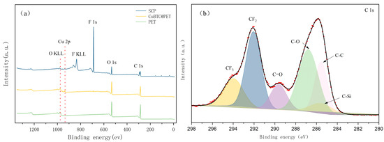 The XPS results for CuBTC@PET composite fiber membranes at different treatment stages are shown in Figure 9, and Cu 2p, F 1s, O 1s, C 1s, F KLL, and O KLL peaks appeared in the XPS spectra of POTS-PET. This was attributed to the in situ growth of CuBTC bonded to POTS. To further confirm the chemical structure of SCP, peak splitting was fitted to the C 1s narrow spectrum. As shown in Figure 9, the spectra of C 1s fitted to six peaks appearing at 294.1 eV, 291.8 eV, 285.3 eV, 282.1 eV, 289.4 eV, and 286.3 eV, which is attributed to the combination of POTS with CF3, CF2, CC, C-Si, C=O, and C in CuBTC. -O. From the above, it can be demonstrated that the low-surface-energy material POTS has successfully formed a hydrophobic coating layer by immersion.