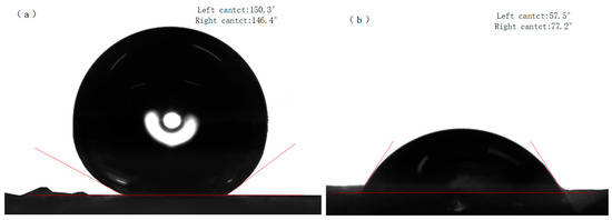 Figure 10b shows the CuBTC@PET water contact angle of 77.2°. When the water droplets stayed on the composite fibers for one minute, it was observed that the water was gradually absorbed by the CuBTC@PET composite fibers. This phenomenon may be attributed to the porous structure of CuBTC, which promotes the absorption of water molecules. Figure 10a shows that the hydrophobicity of SCP is significantly improved, and the water contact angle reaches 146.4°. The water droplets remained intact off the fiber surface after one minute, and no water absorption by CuBTC was observed.