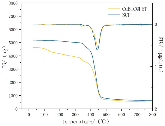 Figure 12 shows the thermogravimetric–differential thermal curves before and after hydrophobic modification. From the figure, we can see that the thermogravimetric–differential thermal curves of CuBTC@PET composite fibers before hydrophobic modification have the following phases: the quality of the fibers remains stable at 0–100 °C, and there is no trend of quality loss; the low-temperature dehydration phase occurs at 100–200 °C, which is mainly due to the adsorption of water molecules in the pore structure of CuBTC, and the water molecules adsorbed in the pore structure of CuBTC are removed by evaporation in the heating; the preliminary thermal decomposition phase occurs at 200–300 °C. At 300 °C, the preliminary thermal decomposition stage, the mass loss in this stage is mainly the breakage of PET chains and the thermal decomposition of the CuBTC organic ligand BTC [34]; at the 300–400 °C thermal stabilization zone, in which CuBTC shows relatively high thermal stability, further decomposition or desorption of small molecules of the remaining organic components in the framework occurs. Above 400 °C, the complete thermal decomposition stage, the PET with the CuBTC begins significant thermal decomposition, leading to the collapse of the structural framework. By comparison, it can be concluded that the TG–DTG curves of SCP fibers are more stable and fluctuation-free before 350 °C. In summary, the POTS coating effectively prevents CuBTC from adsorbing water in the air, prevents its hydrolysis under high-humidity air filtration conditions, and effectively improves the thermal stability before 350 °C.