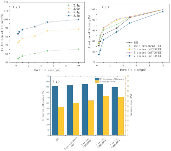 Figure 14c shows the relationship between the filtration efficiency and filtration resistance of 3 μm NaCl particles at different stages of fiber membrane treatment. The reason for choosing 3 μm for separate analysis is that the filtration efficiency of 3 μm particles is the main test for aluminum masks in various countries, and according to the related research, it shows the relationship between NaCl aerosol filtration efficiency and typical bacterial and viral filtration efficiency [10,46]. After five cycles, CuBTC@PET filtration efficiency is 95.3%, and the pressure drop is only 40 Pa; bacterial and viral filtration efficiencies are also standardized.