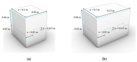 For the sake of consistency with the experimental torsion-shear tests carried out by the authors with others [27,28], the dimensions shown in Figure 2 are defined for stacked blocks with an interlocking joint. Two samples are presented in this figure, one with three and one with five locks. The sample in Figure 2a, in fact, is made of two stacked blocks, the lower one with one central lock and the upper one with two side locks. The sample in Figure 2b instead consists of a lower block with two locks and an upper block with three locks.