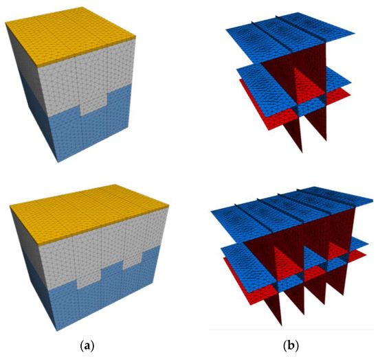 By adopting the assumption of rigid bodies in this paper, each interlocking block can be considered as made of several rigid bodies representing the locks and the main part of the block, as shown in Figure 4a for the three- and five-lock interfaces. The subdivision into smaller parts sketched in this figure is based on the observation that if each block is divided into the main body and the locks, 3DEC displays an error. Considering the abstraction in Figure 1, these bodies are linked by horizontal cohesive interfaces (inner faces coloured red in Figure 4b) with finite shear and tensile strengths, while the horizontal interfaces shared between the blocks are dry faces with zero tensile strength and finite frictional resistance (blue faces in Figure 4b). Note that the provisional yellow parts over the upper blocks are considered fully fixed to avoid potential rocking failure. To avoid the potential sliding interaction between the fixed yellow part and the upper interlocking block, the friction coefficient and the interface between these two entities are set to zero. Later on, it has been observed that the rocking failure does not happen in any of the studied cases.