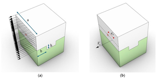 To simulate the torsion-shear interaction at the interlocking interface, the main part of the lower interlocking block is considered to be fixed (depicted in green in Figure 5b), while the top cannot rotate (yellow part in Figure 4a). A non-uniform and linearly distributed force is applied to the whole lateral face of the upper block shown in Figure 5a, involving both the side locks and the main body of this interlocking block. This distributed force is equivalent to a pointed load Vy applied to the block face with the eccentricity ex from the centroid of the face (with ey = 0). This is equal to the lateral force Vy and torque My = Vy ∙ ex applied to the face centroid.