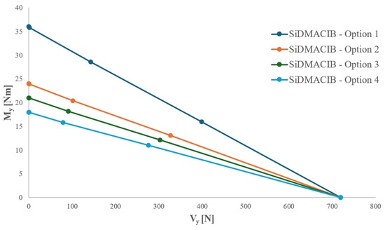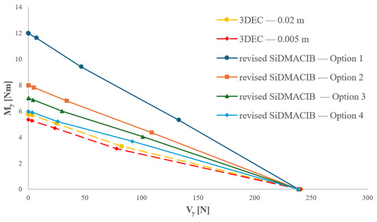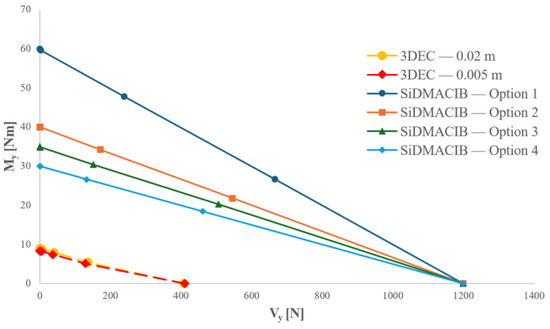 Figure 6 shows the torsion-shear curves obtained for the sample with three locks, using the SiDMACIB model and the four distribution scenarios for the contact points reported in Figure 3, assuming a material shear strength τ = 8 × 104 N/m2. These curves show the maximum lateral force that can be applied to the lateral face of the upper block for different eccentricities from the centroid of the face. Knowing the maximum lateral force Vy and the eccentricity ex, the corresponding maximum torque My can be computed.