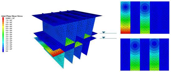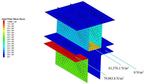 However, the torsion-shear capacities found with SiDMACIB (for all four options) are considerably larger than 3DEC. As mentioned above, the pure shear capacity of all four options of SiDMACIB is 720 N, while this capacity is reduced to 240.76 and 240.83 for the 3DEC models with mesh sizes 0.02 and 0.005 m, respectively. Taking a closer look, it can be observed that the pure shear obtained by SiDMACIB is almost three times larger than the pure shear found with 3DEC. Figure 8 illustrates the distributed shear stresses on the three-lock interfaces when the upper interlocking block is subjected to pure shear forces. It can be noted that while the side lock closer to the subjected lateral forces (directed as shown in Figure 5) experiences failure, the other two locks have not yet initiated failure. This observation aligns with findings previously reported by Jiang et al. [35], who analysed the pure shear strength of interlocking precast concrete blocks utilised in segmental bridges. These authors also presented the sequence of cracking formation for multi-lock joints, both experimentally and numerically.