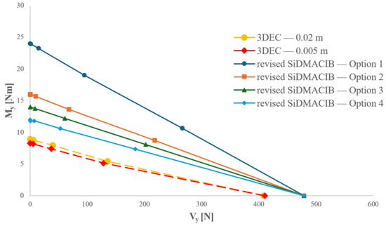 Figure 14 shows the results of the modified SiDMACIB model, in which the number of active locks of the interlocking interface is reduced from five to two. These results are illustrated by continuous lines, while the dashed lines represent the torsion-shear results obtained by 3DEC. It can be observed that, same as the model with three locks, Option 4 of the revised SiDMACIB model has the best agreement with the results found with 3DEC.