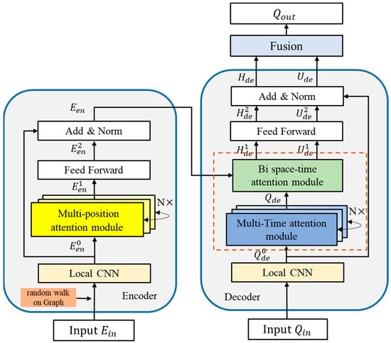 - Decoder: The structure of the decoder is similar to that of the encoder, consisting of a Local CNN layer, double-attention mechanism layers (dotted brown rectangle), an FC-FF layer and a Norm layer. The first layer of the attention mechanism (blue-filled rectangle in Figure 1) is the MT-SSA layer, which takes the output of the Local CNN layer as input to obtain the spatiotemporal feature Qde. The second layer is the BiAtten layer (green-filled rectangle in Figure 1), which takes Een and Qde as the inputs to calculate the bidirectional attention matrix and . After the FC-FF layer and Norm layer, the decoded states can be obtained as Hde and Ude.