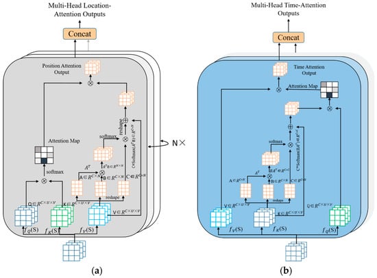 The attention mechanism layer consists of the MH-SSA layer (multi-position attention layer), the MT-SSA layer (multi-time attention layer), and the BiAtten layer (the spatiotemporal bidirectional attention layer). Figure 2 depicts the configuration of the MH-SSA layer and the MT-SSA layer.