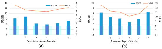 The sensitivity of the proposed MRWG BiAtten model is analyzed. Figure 3a demonstrates that the RMSE error first drops then rises with the increase in attention layers performed on the BikeNYC inflow dataset, and the MAE error has a similar tendency. Therefore, moderately increasing the network depth can increase the prediction accuracy. However, it could face overfitting or other issues if the network is too deep, which can explain the reason that the RMSE error increases with more than four attention layers. Figure 3b shows that the model also behaves similarly on the TaxiNYC inflow dataset.