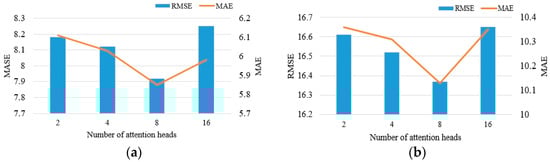 Attention head analysis for MRWG BiAtten. (a) Results of adding attention heads on the BikeNYC dataset. (b) Results of adding attention heads on the TaxiNYC dataset.