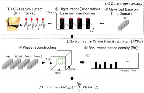 In this section, we describe the proposed method. The proposed method consists of two steps and an equation, as illustrated in Figure 1. Step (A) details the preprocessing steps for inputting the ECG data into the RPDE. In Step (B), the preprocessed data are introduced into the RPDE process to illustrate their manipulation. Finally, in Equation (C), the RPDE values are derived from the input of the processed data.