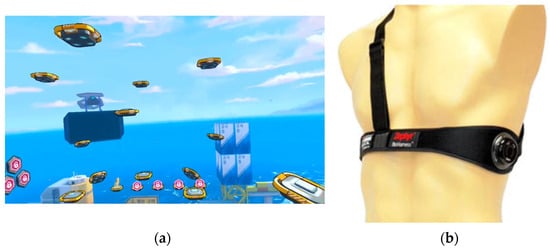 Experiment environment: (a) virtual reality (VR) experiment content; (b) form of the electrocardiography (ECG) sensor.