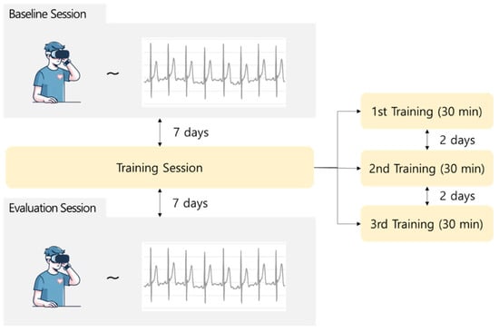 The experimental process is illustrated in Figure 3. During the baseline session, participants watched VR sickness-inducing content for 30 min, and SSQ surveys and ECG data were collected. After completion of the baseline session, the training session was conducted at 7-day intervals. The training session consisted of three sessions, each involving the continuous repetition of VR sickness-inducing content with the same pattern. This was aimed at familiarizing the participants with VR sickness by repeatedly exposing them to the same VR sickness pattern for 30 min in each training session. Finally, during the evaluation session, the participants watched the same experimental content as that presented in the baseline session, and the SSQ surveys and ECG data were collected. The scores for each SSQ collected during the baseline and evaluation sessions were computed as listed in Table 1.