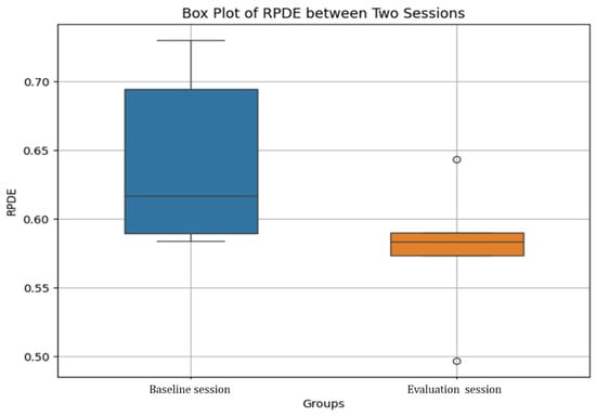 The SSQ scores in the evaluation session decreased by approximately 20% compared with those in the baseline session. Notably, in the nausea domain, the p-value was 0.04, and in the oculomotor discomfort domain, it was 0.02, indicating a statistically significant difference. Considering the statistically significant differences observed in certain areas of VR sickness between the baseline and evaluation sessions, the RPDE was extracted from the ECG data of both sessions for statistical analysis. Owing to equipment issues, only ECG data from 5 of the 13 participants were available for analysis. Therefore, the RPDE values were extracted and a statistical analysis was conducted based on the proposed method (Section 1) for these five participants.