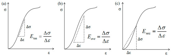 (a) is the tangent elastic modulus, (b) is the average elastic modulus, (c) is the secant elastic modulus [39].