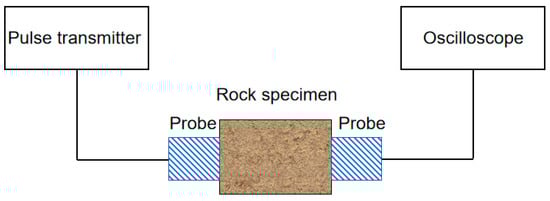 The second method is to convert the speed of ultrasonic propagation in rock specimens through laboratory tests. Using the ultrasonic pulse transmission method to measure the P-wave and S-wave velocity of rock samples, the experimental principle is shown in Figure 2. First, connect the two probes and observe whether the jumping time of the received waveform on the oscilloscope is zero. If the starting point time does not return to zero, adjust the knob of the pulse position in the pulse source to set the starting point time to zero, and the oscilloscope can directly detect the time when the first wave arrives [36]. Based on the theory of elastic waves, Equations (3) and (4) can be used to determine the dynamic elastic modulus (Ed) and Poisson’s ratio (μd) of rocks [34].
