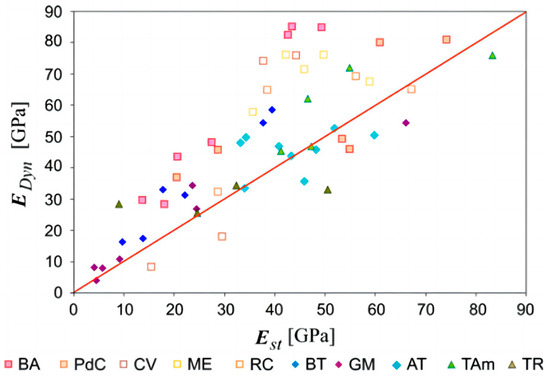 Martinez Martinez et al. [32] obtained new correlations by testing 10 different carbonate rocks extracted in Spain. Because carbonate rocks are rocks with fractures, voids, and/or weathering, conventional ultrasonic testing indirectly measures mechanical parameters, which can cause errors in the results. Therefore, the variable of spatial attenuation was introduced because they are highly sensitive to the existence of rock defects. They used Equation (34) to ascertain the spatial attenuation of dynamic elastic modulus and compression wave to provide an accurate prediction of the static elastic modulus. This empirical formula is very useful for rocks with fractures, voids, and/or weathering, filling the gap in our collective knowledge with regard to this issue. In Figure 4, they conclude that in most situations. The dynamic modulus of elasticity exceeds the static modulus of elasticity. The symbols in the Figure 4 are explained as follows. Blanco Alconera (BA): white crystalline limestone; Piedra de Colmenar (PdC): grey and white lacustrine fossiliferous limestone; Travertino Amarillo (TAm): porous layered limestone; Travertino Rojo (TR): porous layered limestone; Gris Macael (GM): grey calcite marble; Blanco Tranco (BT): white homogeneous calcite marble; Amarillo Triana (AT): yellow dolomite marble; Crema Valencia (CV): cream micritic limestone; Rojo Cehegı´n (RC): micritic limestone; Marro´n Emperador (ME): brown brecciated dolostone.