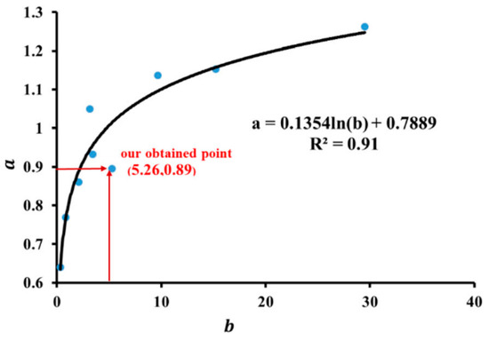 Based on the analysis of the previously published linear correlation between Es and Ed in Table 3, we find that some predictions differ significantly from reality. Some equations may calculate negative values of elastic modulus, so the data with negative constants b in Table 3 are not included in Figure 6, we can observe a strong correlation between the constant parameters a and b. As shown in Figure 6, the correlation is high with R2 = 0.93. This means that the Es depend only on the Ed. The correlation coefficient obtained by this study is higher than that obtained by Davarpanah et al. [39]. The following is the fitting equation between a and b: