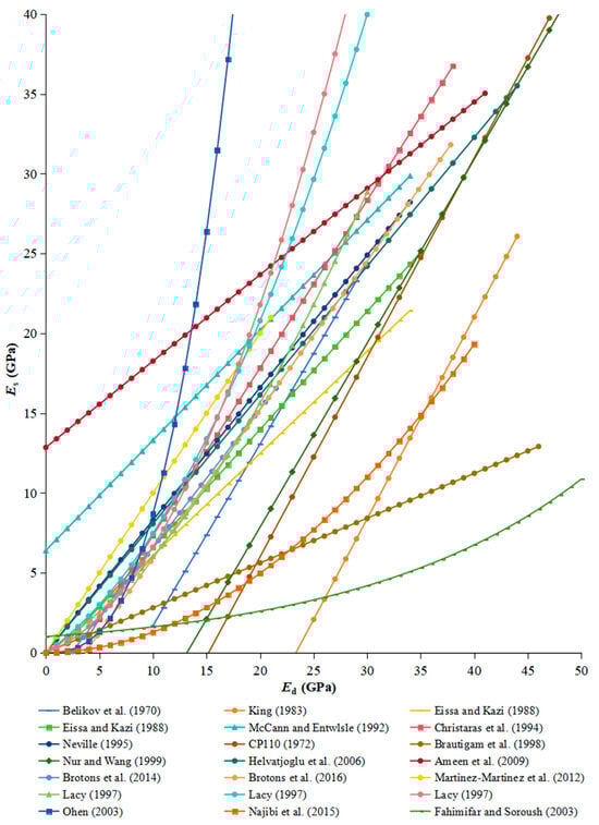 Correlation between static (Es) and dynamic (Ed) moduli proposed by various authors [7,10,29,30,32,33,43,44,45,46,47,48,49,51,53,54,55,56].
